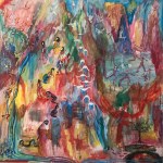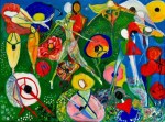 The square painting shows the gut in the middle as a green landscape with luxurious vegetation. The colon is a citadel wall that protects the park. Healthy choices are encouraged in order to have a beautiful gut. The crocodile in the middle represents the desire to do something that is not healthy, but is subdued by the Flamenco guitarist, who represents the ability of passion to help us walk on the right path; we feel fulfilled when we follow our passion and forget about unhealthy desires. On the left side is a harpist with celestial attributes that heals the gut with kindness, as she improves one’s wellbeing and helps to pass through a difficult situation. At the bottom of the painting a drummer plays the monastery buoy song of the lifecycle. She reminds us that deep breathing takes effort and has to be made. Her skirt is made of the sea and the salmon that jumps out of the sea is a model to live a life of fulfillment although destined to great difficulty. At the top three flamenco dancers remind of the inner strength we need to search through our passion.