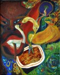 That’s the way the cookie crumbles is a painting which represents the gut as a foundry-aqueduct construction from which the products are delivered through the rectum hole at the lower center of the painting. The title refers to the excrements we produce which result from our way of living. The heart is pouring energy into the system and is represented as the cauldron at the top center. In the middle of the painting the small intestine is represented as a central train station. In this landscape I illustrated several artists who made this world better. Music is represented by James Brown, Celia Cruz, Freddie Mercury, Paolo Conte, Paul Desmond and Dave Brubeck, B.B. King. Dance in represented by Nijinsky, Mary Wigman cat that jumps above the rectum by executing a pas de chat. Cinema is represented by Charlie Chaplin and theatre by the costume design of the Dottore della Pesta and Arlecchino. Photography is referenced through Muybridge by the kid running on the drums. Sculpture is represented through the image of the Capitoline Wolfe as well as the reference to the foundry process. Architecture is present through the aqueduct and truss structure in the painting. Literature is referenced through the flying horse, the witch and the phoenix, which are popular characters in fairy tales. The dove is a reference to the Holy Spirit, the presence of creativity in each of us. Although art gives us energy, it also consumes a lot when it is created or when we digest the emotions and the thoughts that are expressed. The trains represent our hectic way of living as well as the tremendous work our organism does to sustain it. Therefore, the painting is an invitation to appreciate the excitement of life with some consideration for the harmony of the body.