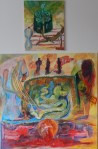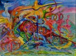 God please help me is a painting that represents the cyclic challenges one experiences through life and proposes some solutions. In the center a character shows a Tai Chi movement that looks like flying, representing harmony and peace. The one on her left is struggling through the process, but experiences different states of emotions, good and bad. Near the left edge a rower rows against an impossible vertical river and encourages one to enjoy life as crazy as it seems. Higher up there are two people carrying a boat as a reminder that help is available and one should ask for it. On the right side of the painting is a ballet scene, which symbolizes grace and kindness as a means to appreciate life. At the top we can see a dove flying, symbol of The Holy Spirit, that illuminates our true potential, suggesting we have to keep the faith and move forward through the cycles.