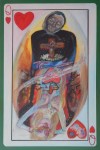 This painting presents the card of the King of Hearts on a green table cloth. The card presents issues faced by humanity today and considers the link between power and money as central values.