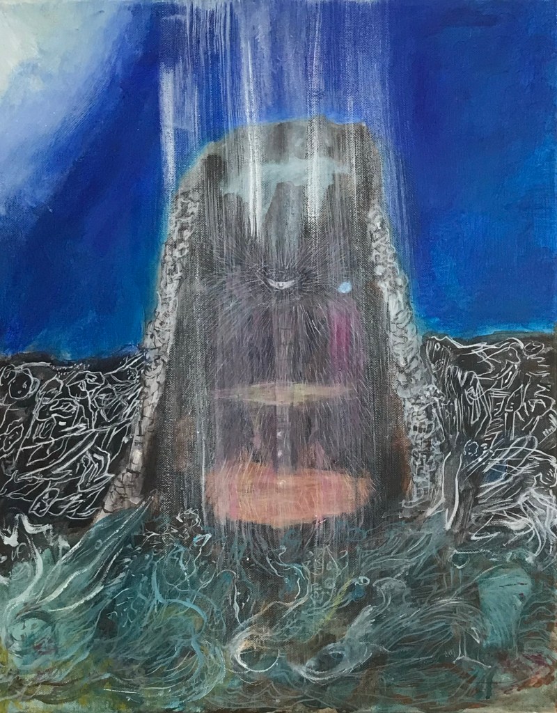 Sliding on a ray… from the poem “Lucifer” by Mihail Eminescu, Acrylics on canvas, 36 x 24 in, 2025