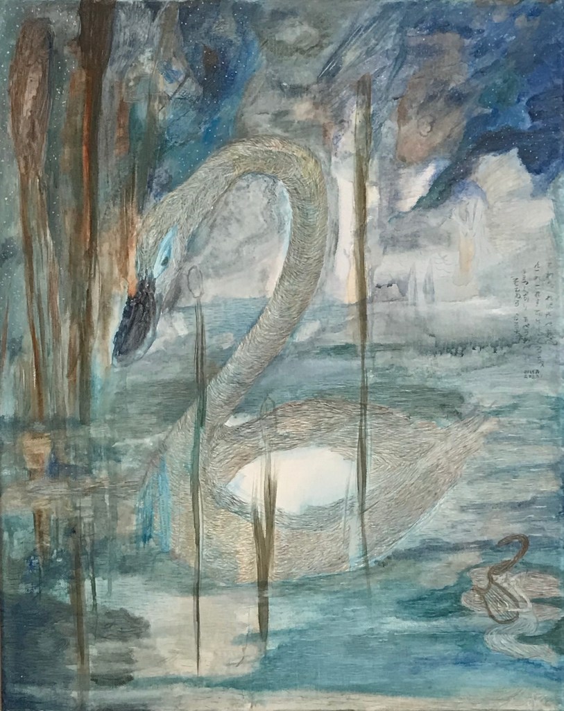 “Swan sliding on water to go sleep among the reeds … ” from the poem “Sleeping birds” by Mihail Eminescu, Acrylic on canvas, 20x 16 in, 2025